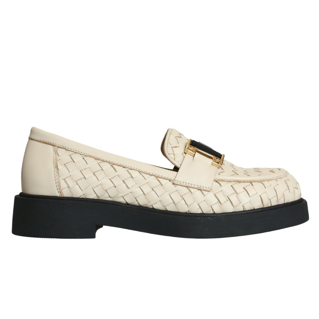 Bej Deri Örgülü Kadın Tokalı Loafer