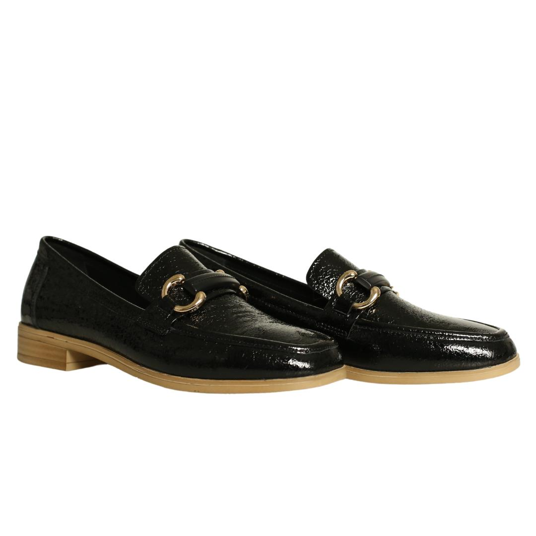 Siyah Rugan Deri Kadın Tokalı Babet